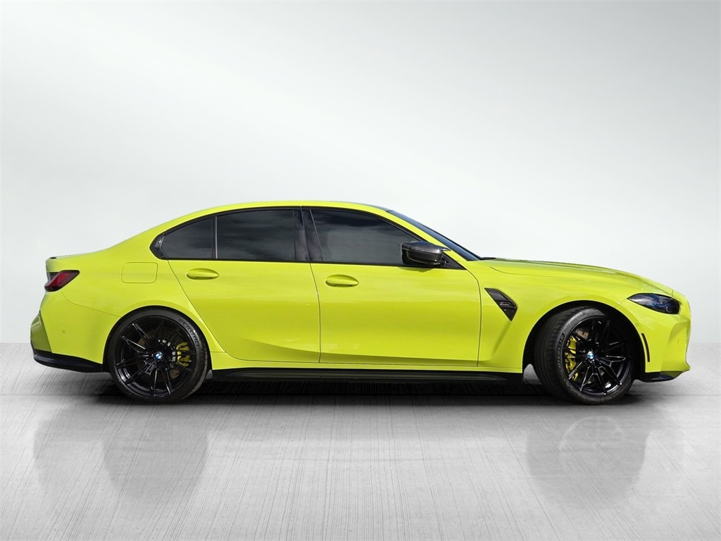 Sao Paulo Yellow 2023 BMW M3 Competition 4D Sedan AWD 3.0L I6 Turbocharged DOHC 24V LEV3-ULEV70 503hp 8-Speed Automatic Steptronic 16 Speakers, 4-Wheel Disc Brakes, Active Driving Assistant Pro, Adaptive suspension, Air Conditioning, AM/FM radio: SiriusXM, Apple CarPlay & Android Auto Compatibility, Auto-dimming door mirrors, BMW Assist eCall, BMW Curved Display, BMW Head Up Display, BMW TeleServices, Connected Package Pro, ConnectedDrive Services, Drive Recorder, Driver vanity mirror, Driving Assistance Professional Package, Dual front side impact airbags, Executive Package, Extended Merino Leather Upholstery, Extended Traffic Jam Assistant, Four wheel independent suspension, Front anti-roll bar, Front Bucket Seats, Front Center Armrest, Front Ventilated Seats, harman/kardon Surround Sound System, harman/kardon® Speakers, Heated door mirrors, Heated Front Seats, Heated front seats, Heated Steering Wheel, Illuminated entry, Knee airbag, Leather Shift Knob, Low tire pressure warning, Lumbar Support, M Carbon Bucket Seats, M Carbon Exterior Package, M Compound Brakes w/Black Calipers, M Drive Professional, M Sport Seats, Memory seat, Navigation System, Overhead airbag, Parking Assistance Package, Parking Assistant Plus, Passenger door bin, Passenger vanity mirror, Personal eSIM 5G, Power door mirrors, Power Front Seats, Power steering, Power Tailgate, Radio data system, Radio: AM/FM Audio System, Rear air conditioning, Rear window defroster, Remote Engine Start, SensaTec Dashboard, SiriusXM Satellite Radio w/1 Year Subscription, Sport steering wheel, Steering wheel mounted audio controls, Tachometer, Telescoping steering wheel, Tilt steering wheel, Trip computer, Variably intermittent wipers, Wheels: 19"x9.5" Fr. & 20"x10.5" Rr. Orbit Gray.