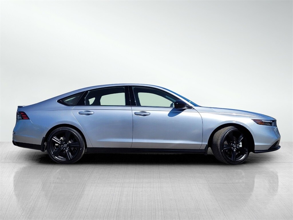 Lunar Silver Metallic 2023 Honda Accord Hybrid Sport-L FWD eCVT 2.0L 16V DOHC 2.0L 16V DOHC, 4-Wheel Disc Brakes, ABS brakes, Air Conditioning, Apple CarPlay/Android Auto, Auto High-beam Headlights, Automatic temperature control, Brake assist, Driver door bin, Driver vanity mirror, Dual front impact airbags, Electronic Stability Control, Exterior Parking Camera Rear, Four wheel independent suspension, Front anti-roll bar, Front Bucket Seats, Heated front seats, Illuminated entry, Lane departure: Lane Keeping Assist System (LKAS) active, Leather steering wheel, Low tire pressure warning, Overhead airbag, Passenger vanity mirror, Power driver seat, Power windows, Rear side impact airbag, Rear window defroster, Security system, Speed control, Split folding rear seat, Spoiler, Steering wheel mounted audio controls, Traction control, Variably intermittent wipers, Wheels: 19" x 8.5J Matte Berlina Black.